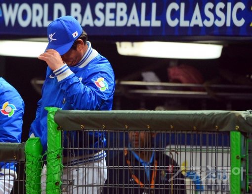 5일 저녁 타이중 인터콘티넨탈구장에서 열린 제3회 월드베이스볼클래식(WBC) 대한민국과 대만의 경기에서 4회초 대만이 2-0으로 앞서자 류중일 감독이 고개를 숙이고있다.