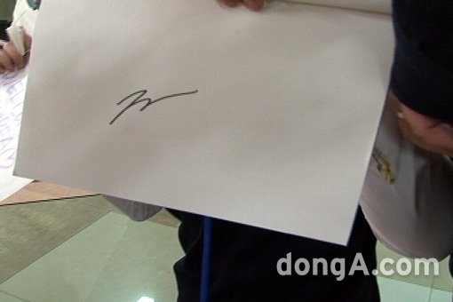하지만 슈퍼스타 디캐프리오의 사인은 예상과 전혀 달랐다. 그의 사인을 본 사람들은 하나같이 헉! 소리를 내며 두 눈을 의심했다. 과연 그의 사인은 어떤 모습일까. 사진을 보면 알 수 있다. 세계적인 꽃미남인 그의 외모와 전혀 어울리지 않는 사인. 숫자 3을 적은 듯한 사인을 보고 깜짝 놀랐다. 왠지 누구나 할 수 있을 듯한 사인이었다. 그래도 사인을 받은 팬들은 계속해서 큰 소리를 내며 기뻐했다. 조금 당황스럽긴 했지만 한국에서 디캐프리오에게 사인을 받을 확률을 감안하면 충분히 이해가 되는 장면이었다.