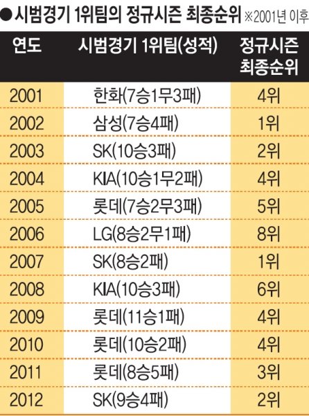 지난 12년간의 기록을 들여다보면 시범경기 1위를 차지한 팀이 포스트시즌에 진출한 사례는 모두 9번이나 된다. 삼성은 2002년 시범경기를 1위로 마친 뒤 한국시리즈 우승을 거머쥐었다. SK도 2007년 시범경기에서 1위에 올랐고, 한국시리즈 우승컵을 거머쥐었다. 반면 시범경기에서 1위를 차지했지만 포스트시즌에 오르지 못한 경우는 3차례였다. 2005년 롯데, 2006년 LG, 2008년 KIA는 시범경기에서 쾌속 질주했지만 가을에는 훈련만 했다.