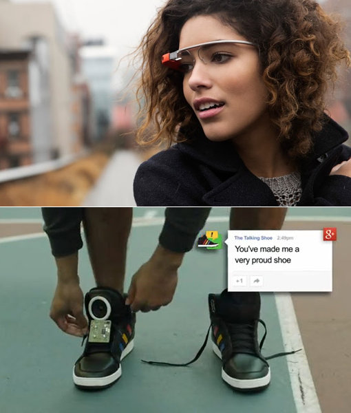 안경과 시계, 신발 등 신체에 직접 착용하는 ‘웨어러블 컴퓨터’ 경쟁이 가속화 되고 있다. GPS와 카메라 등을 이용해 다양한 정보를 주고받을 수 있는 스마트 안경 ‘구글글래스’를 쓰고 있는 모델(위쪽)과 최근 유튜브에 공개된 말하는 신발. 사진|구글·유투브 동영상 캡처