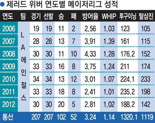 루키시즌부터 7년 연속 두 자릿수 승리를 따낸 위버는 마운드에 오를 때마다 뒤편 흙에 ‘NA’를 새겨 넣는다. 4년 전 음주 운전자에게 사고를 당해 세상을 떠난 아덴하트를 기리기 위해 이니셜을 쓰는 것. 월드시리즈 우승을 이끌어 하늘나라로 먼저 간 아덴하트에게 자랑스러운 친구가 되고 싶다는 그의 소박한 바람이 올해 반드시 이뤄지기를 많은 에인절스 팬들이 간절히 바라고 있다.