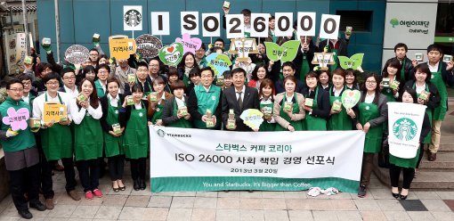 ㈜스타벅스커피 코리아(대표 이석구)는 21일 커피 업계 최초로 사회 책임 경영의 국제 표준인 ISO26000을 도입하고, 기존의 사회 공헌 및 투명 경영 활동을 더욱 체계적으로 실시하기로 했다고 밝혔다.