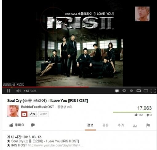 가수 소울크라이가 참여한 드라마 ‘아이리스2’OST곡 ‘아이 러브 유(I Love You)’가 유투브에서 폭발적인 조회 수를 기록 하고 있다.