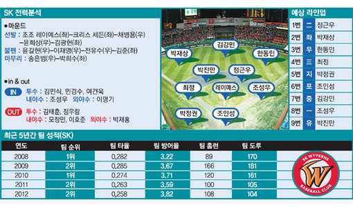 지난 겨울 마무리 정우람(공익근무)과 4번타자 이호준(NC)을 잃어 전력에는 분명 누수가 있었다. 정우람을 대신해 뒷문을 책임질 예정이던 박희수마저 월드베이스볼클래식(WBC)에서 부상을 당해 시즌 초반 합류가 불가능하다. 그러나 스프링캠프에서 새 얼굴들을 발굴했고, 어깨부상을 앓던 에이스 김광현이 성공적인 재활로 4월 중 합류가 가능해졌다. 무엇보다 6년 연속 한국시리즈 진출을 통해 축적한 경험이 가장 큰 강점이다.