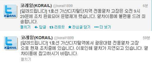 이어 코레일 측은 오전 9시 29분에 조치(복구) 완료돼 운행을 재개한다고 밝혔다. 현재 1호선은 정상운행 중이다.