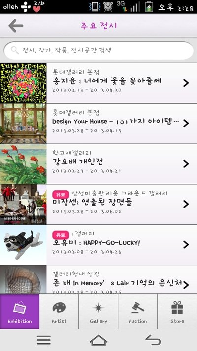 메인화면 관심이 있는 전시회 이미지를 누르면 상세정보 창이 뜨는데, 일정과 시간, 장소, 가격, 평점, 전시개요, 전시작품 등을 볼 수 있다. 또한, 직접 전시회 담당 부서로 전화연결을 할 수도 있으며, 전시회장의 이미지도 앱에서 바로 지도를 연결해 볼 수도 있어 편리하다. 자신이 직접 평점을 매기거나, 댓글을 달아 사람들과 의견을 공유할 수도 있다.