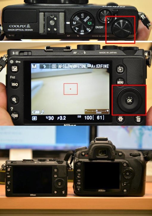 쿨픽스A는 크기는 작지만 갖출 것은 다 갖췄다. 가장 먼저 보이는 것은 조작 다이얼이 2개라는 것. 다이얼이 하나뿐인 보급형 DSLR 니콘 D5200, D3200 등은 M(수동)모드에서 셔터속도와 조리개를 한번에 하나만 조절할 수 있다. 이를 조절하기 위해 다른 버튼 하나를 추가로 눌러야 하는 번거로움도 있다. 그만큼 조작속도가 느리다. 이와 달리 쿨픽스A는 조작 다이얼 2개로 셔터속도와 조리개를 조절할 수 있어, 조작속도가 빠르다. 그리고 이 모든 것을 한 손으로 할 수 있다. 뒷면(액정이 있는 부분) 인터페이스도 기존 니콘 DSLR 카메라와 비슷하다. 니콘 DSLR 사용자라면 익숙할 것이다.