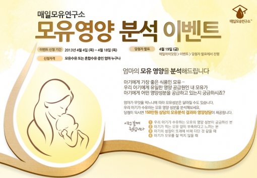 매일유업(대표 이창근)에서는 4일~18일까지 모유수유 또는 혼합수유부를 대상으로 모유영양 정밀 분석과 상담 서비스를 제공하는 ‘모유영양성분 정밀분석 이벤트’를 진행한다.