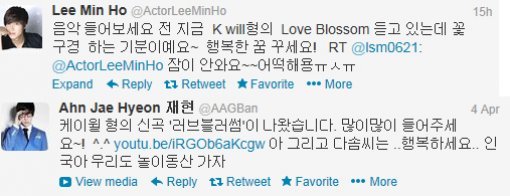 6일 새벽 이민호는 자신의 트위터를 통해 잠이 오지 않는다는 한 팬의 글에 “음악 들어보세요 전 지금 K will형의 Love Blossom 듣고 있는데 꽃 구경 하는 기분이예요~ 행복한 꿈 꾸세요!”라는 글을 올리며 케이윌의 신곡 ‘러브 블러썸’을 추천했다.