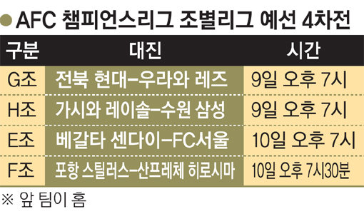 아시아축구연맹(AFC) 챔피언스리그 조별리그 4차전이자 리턴매치로 치러지는 한일 클럽 대항전이 9, 10일 이틀간에 걸쳐 펼쳐진다. 주말 K리그 클래식(1부 리그) 빅뱅을 앞둔 수원과 서울은 나란히 적지로 떠났지만 상황은 다르다. 수원은 가시와를 상대로 대회 첫 승을, 서울은 센다이전을 통해 16강행을 사실상 확정지을 참이다. 수원은 현재 2무1패, 서울은 2승1무를 기록 중이다. 1승2무의 전북과 포항은 안방에서 일본 팀들을 만나는데, 각각 우라와, 히로시마와 격돌한다.