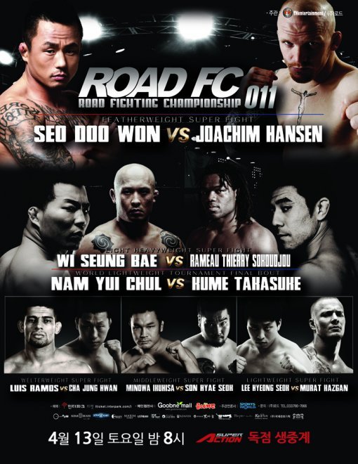 ‘로드FC 011’은 오는 13일(토) 서울 올림픽공원에서 열리며, 수퍼액션에서 당일 저녁 8시에 독점 생중계된다.