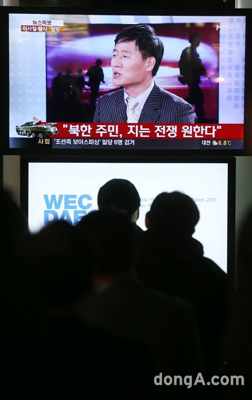 북한 미사일 발사 위협으로 긴장감이 고조된 10일 오후 서울역 대합실에서 시민들이 관련 뉴스를 보고 있다.