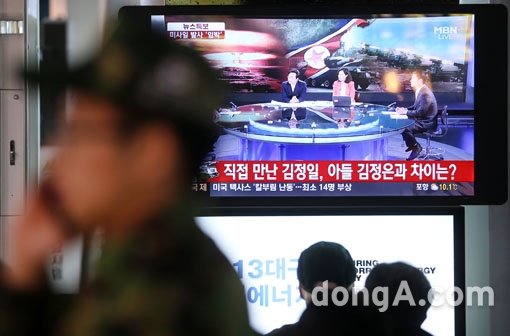 북한 미사일 발사 위협으로 긴장감이 고조된 10일 오후 서울역 대합실에서 시민들이 관련 뉴스를 보고 있다.