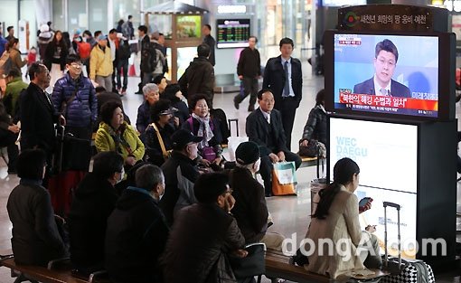 북한 미사일 발사 위협으로 긴장감이 고조된 10일 오후 서울역 대합실에서 시민들이 관련 뉴스를 보고 있다.