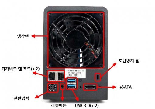 제품 후면을 살펴보면 냉각팬과 eSATA 포트, 그리고 각각 2개의 USB 포트와 랜 포트를 확인할 수 있다. 후면 USB 포트는 둘 다 기존 USB 2.0에 비해 최대 10배 높은 대역폭(데이터가 지나가는 통로)을 지원하는 USB 3.0 규격이라 이를 지원하는 USB메모리나 외장하드를 꽂으면 빠르게 데이터 전송을 할 수 있다.