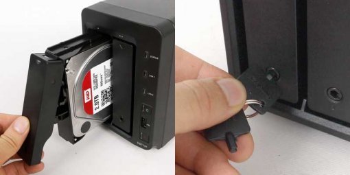 참고로 DS713+는 전원이 켜진 상태에서도 HDD를 교체할 수 있는 핫스왑(hotswap) 기능을 지원한다. 그래도 동작 중에 의도치 않게 본체 전면을 건드려서 갑자기 HDD가 튀어나오는 사태는 어지간해서는 피하고 싶을 테니 이 때를 대비해 HDD 장착 후에는 동봉된 육각나사 모양의 열쇠를 이용해 베이를 잠가두도록 하자.