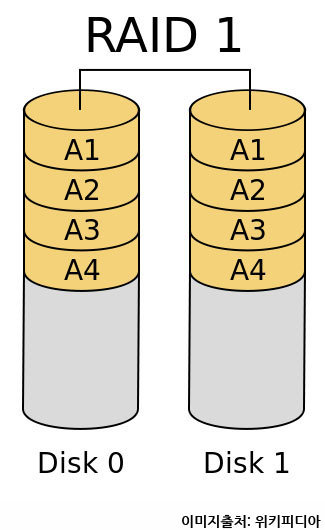 -이 역시 2대 이상의 HDD만 있으면 구성할 수 있다. 하나의 데이터를 쪼개서 저장하는 RAID 0와 달리, 각 HDD에 완전한 데이터를 동일하게 저장한다. 이렇게 하면 다수의 HDD가 고장 나더라도 단 1개의 HDD만 살아있다면 모든 데이터를 온전하게 살릴 수 있다.