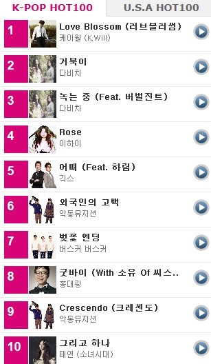 멜론 등 국내 주요 음원차트에서 1위를 기록중인 가수 케이윌의 신곡 ‘러브 블러섬’이 미국 빌보드 케이팝 차트 1위에 올랐다.