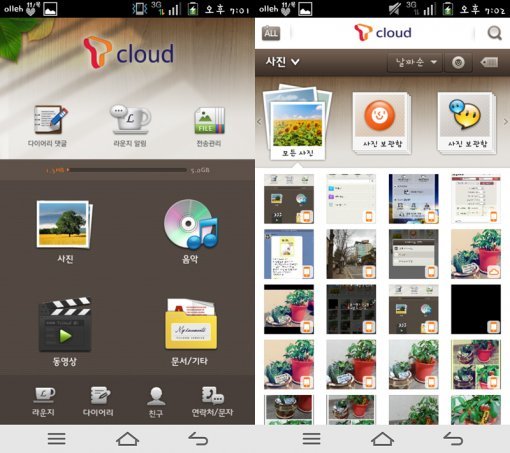 T클라우드 앱을 내려받은 후 통합 ID나 신규 ID로 접속하면 5GB의 저장공간이 주어진다. 대신 SK텔레콤 가입자는 10GB의 용량을 지원한다. 사진이나 음악, 동영상, 문서/기타 등으로 분류돼 있어 분류에 따라 콘텐츠를 찾기 쉽다.