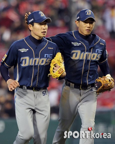 11일 오후 서울 잠실야구장에서 열린 ‘2013 한국 야쿠르트 세븐 프로야구’ LG 트윈스와 NC 다이노스의 경기에서 NC 선발 이재학이 3회말을 삼자범퇴로 깔끔히 막고 더그아웃으로 들어오며 차화준의 격려를 받고 있다.