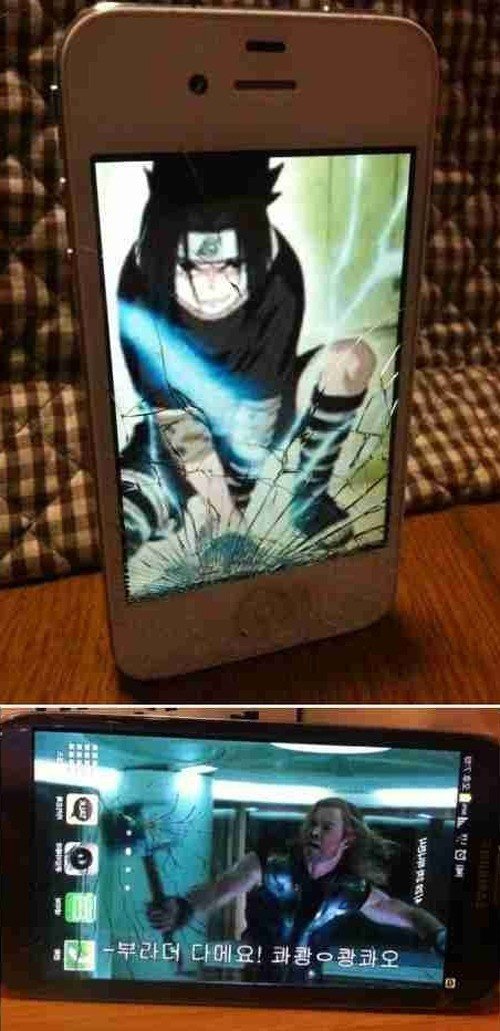 게시물에는 두 장의 사진이 담겨 있다. 사진 속에는 스마트폰이 있으며 그 안에는 영화 토르와 애니메이션 나루토의 캐릭터를 이용해 깨진 액정 부분이 마치 등장인물의 힘으로 박살난 것처럼 보이게 하고 있다.