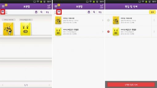 카카오페이지를 실행하면 가장 먼저 보관함이 나타난다. 이곳은 스토어에서 구매한 콘텐츠를 보관하는 곳으로, 구매한 목록을 썸네일형이나 리스트형으로 볼 수 있다. 이밖에 초코(카카오톡, 카카오페이지 등에서 사용하는 사이버 머니, 1초코=100원)충전, 내려 받은 콘텐츠 관리(삭제, 순서 변경 등) 등을 할 수 있다.
