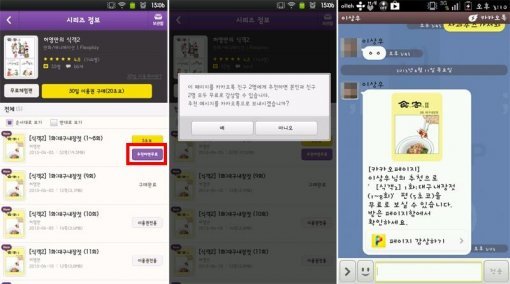 스토어에서 콘텐츠를 구매할 때 ‘친구와 같이 보기’ 버튼을 누르면 카카오톡 친구 1명에게 해당 콘텐츠를 보낼 수 있다. 물론 전송 받은 친구는 해당 콘텐츠를 무료로 이용할 수 있다.