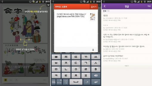 각 페이지는 카카오스토리와 연동돼, 재미있게 본 페이지를 포스팅해 친구에게 보여줄 수 있다. 또한, 콘텐츠에 댓글을 달 수 있어 다른 사람과 의견을 나누거나 콘텐츠 제작자에게 하고 싶은 말을 남길 수 있다. 댓글은 해당 콘텐츠를 구매한 사람만 남길 수 있다.
