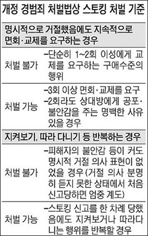 또한 2회 구애 경우에도 상대방에게 공포나 불안감을 주는 명백한 사유가 있을 경우나 스토킹 신고를 이미 한 경우에는 지켜보거나 따라다닐 시에도 처벌 대상이 된다고 명시했다.