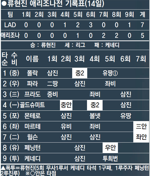류현진은 한국 프로야구를 직구와 서클 체인지업 두 가지 구종으로 평정했다. 그런데 메이저리그에 진출해서 류현진은 슬라이더 비율을 높여가고 있다. 첫 승을 거둔 8일 피츠버그전에서도 슬라이더가 효자 노릇을 하더니 14일 애리조나전에서도 슬라이더를 결정구로 구사해 상대의 허를 찔렀다.