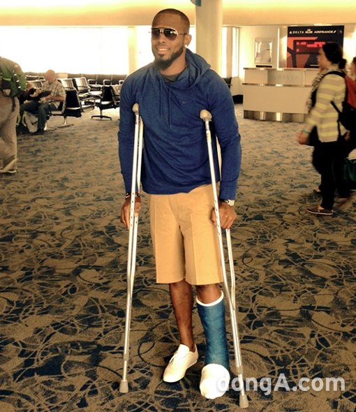 발목 부상으로 깁스를 한 채 목발을 짚고 있는 호세 레이예스의 모습. 동아닷컴