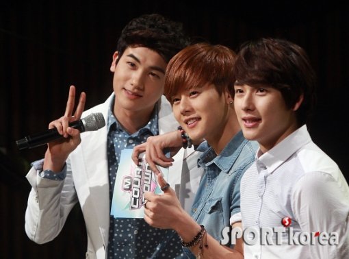 18일 오후 서울 상암동 CJ E&M에서 열린 ‘Mnet 엠카운트다운’(엠카)에 출연한 MC 제아파이브 형식, 동준, 시완(왼쪽부터)이 깜찍한 포즈를 취하고 있다.