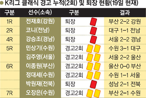 K리그 클래식(1부 리그)이 7라운드를 마친 가운데 한 명이 경고 2회 누적이나 직접 퇴장으로 빠진 팀이 승점 3을 챙길 확률은 얼마나 될까. 현재까지 퇴장 선수가 나온 팀이 승전고를 울린 건 한 번 뿐이다. 그렇다고 퇴장이 꼭 패배로 직결되는 것도 아니었다.