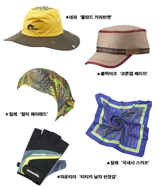 모자도 빼놓을 수 없는 아웃도어 패션 아이템이다. 블랙야크의 ‘코튼캡’(5만1000원)은 공군모자 디자인으로 캡의 캐주얼함을 살렸다. ‘노포멀햇’(6만3000원)은 블랙야크 백컨트리 라인의 남녀공용 고어햇이다. 챙이 짧고 가벼운 스타일이 특징.