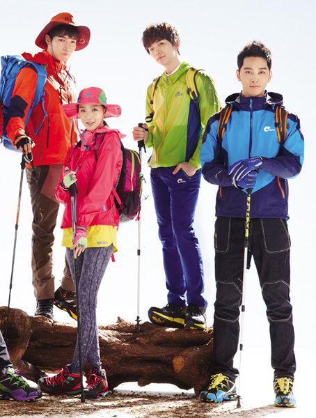 모자, 장갑, 양말 등 소품을 활용해 멋을 낸 여성모델(왼쪽에서 두번째). 아웃도어 패션의 소품은 멋뿐만 아니라 다양한 기능을 포함하고 있어 적절히 활용하면 더욱 편하고 재미있는 아웃도어 활동을 즐길 수 있다. 사진제공|네파