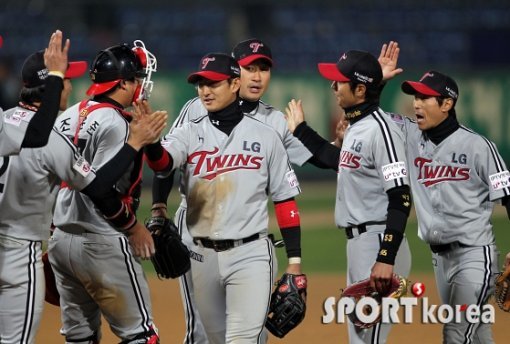 18일 오후 광주 무등야구장에서 열린 ‘2013 한국 야쿠르트 세븐 프로야구’ KIA 타이거즈와 LG 트윈스의 경기에서 양 팀 도합 36안타를 치며 약 5시간동안 역전에 역전을 거듭하는 난타전을 벌인 결과 LG가 KIA를 13-12로 꺾고 선수들이 그라운드에서 기쁨을 나누고 있다.