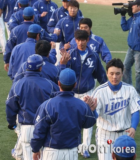 경기종료 후 삼성 선수들이 그라운드 위에서 승리의 기쁨을 나누고 있다.