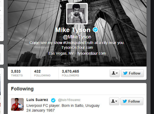 마이크 타이슨이 루이스 수아레즈를 트위터 팔로우 해 화제다. 마이크 타이슨 트위터 화면 캡처
