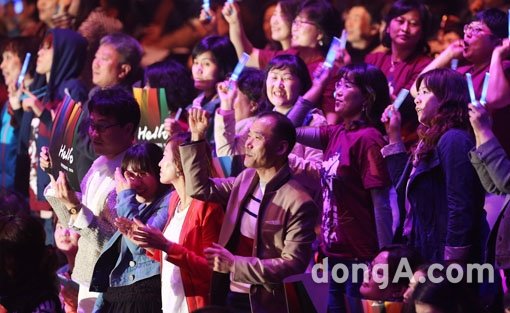23일 오후 서울 송파구 올림픽공원 내 올림픽홀에서 열린 조용필 19집 헬로(hello) 발매 기념 프리미어 쇼케이스에서 팬들이 환호하고 있다. 인터넷을 통해 전세계로 생중계되는 이번 쇼케이스는 자우림, 박정현, 국카스텐, 버벌진트, 팬텀, 이디오테잎 등 후배가수들의 축하 무대로 펼쳐진다.