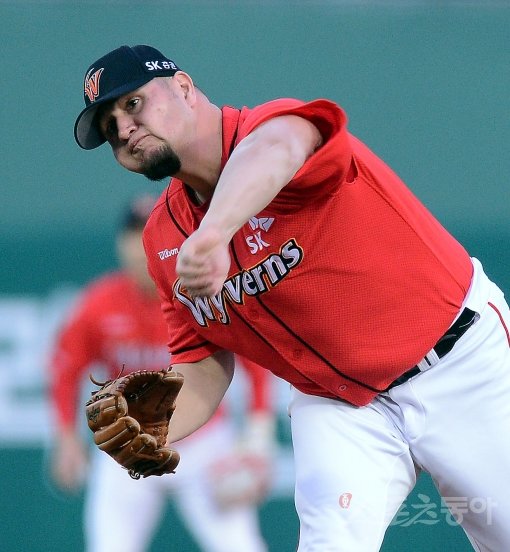 '2013 한국야쿠르트 세븐' 프로야구 SK와이번스 대 롯데자이언츠 경기가 24일 부산 사직야구장에서 열렸다. 선발 투수로 등판한 SK 레이예스가 힘차게 볼을 던지고 있다.