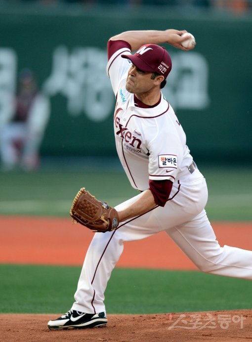 24일 오후 서울 목동야구장에서 '2013 한국야쿠르트 세븐 프로야구' 넥센 히어로즈와 두산 베어스의 경기가 열렸다. 넥센 선발투수 나이트가 힘차게 볼을 던지고 있다.