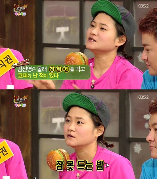 김신영은 4월25일 방송된 KBS 2TV ‘해피투게더3’에서 어린 시절 아무것도 모른 채 정력제를 먹고 고생했던 경험을 털어놨다.