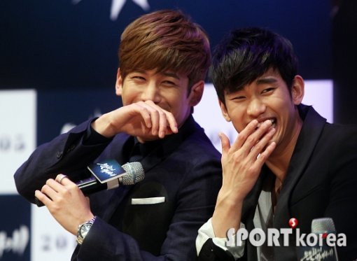 30일 오후 서울 건대 새천년홀에서 열린 영화 ‘은밀하게 위대하게’ 쇼케이스에 참석한 배우 박기웅, 김수현(오른쪽)가 미소를 짓고 있다.