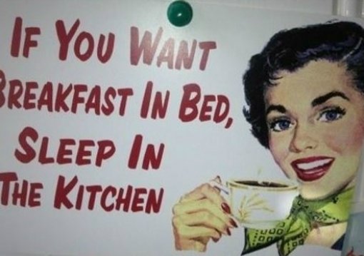 공개된 사진에는 ‘침대에서 아침을 먹고 싶다면 주방에서 잠을 자라(If you want breakfast in bed, sleep in the kitchen)’라는 문구가 적혀 있는 모습이 담겨 있다.