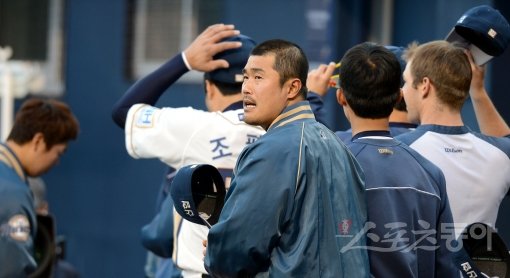 맏형의 삭발은 효과가 있었다. NC 주장 이호준(고개 돌린 선수)은 30일 마산 LG전에 앞서 머리를 짧게 밀고 경기장에 나왔다. NC 선수단은 정신무장을 새롭게 했다. 결국 NC는 시즌 4번째 승리를 거뒀다. 창원|김민성 기자