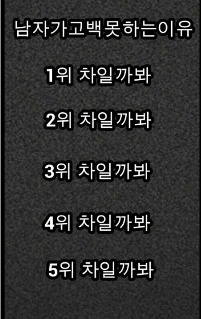 '남자가 고백 못 하는 이유' 게시물에 따르면 남자가 이성에게 고백을 하지 못하는 이유는 '차일까봐'로 동일했다.