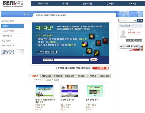 파고다는 사용자들이 만든 파워포인트를 공유하는 사이트로, '파워포인트 고수들이 다 모인 곳'이라는 뜻이다. 삼성경제연구소 홈페이지에 회원가입 해야 이용할 수 있다. 서식, 다이어그램, 차트 및 도형, 사진 등 다양한 자료가 있으며, 파고다 SOS라는 묻고 답하기 게시판이 있어 PPT에 관한 질문 등을 올리고 답변받을 수 있다.