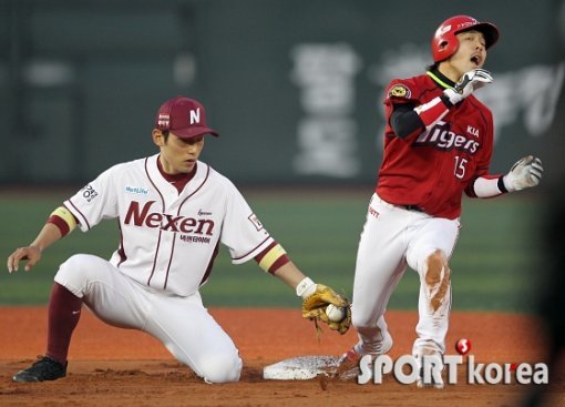 3일 오후 서울 목동구장에서 열린 `2013 한국야쿠르트 세븐 프로야구` 넥센 히어로즈와 KIA 타이거즈의 경기 KIA 3회초 1사 1루에서 2번 홍재호 타석 때 1루주자 이용규가 2루도루를 시도했으나 넥센 서건창에게 태그아웃 당한 뒤 억울해 하고 있다.