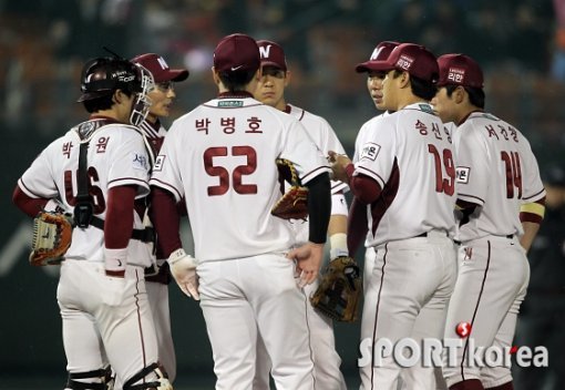 3일 오후 서울 목동구장에서 열린 `2013 한국야쿠르트 세븐 프로야구` 넥센 히어로즈와 KIA 타이거즈의 경기에서 넥센 염경엽 감독이 8회초 2사 만루의 위기를 맞자 그라운드에 올라와 선수들에게 지시를 하고 있다.