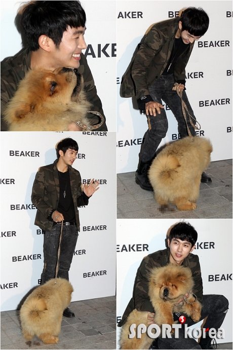 2AM 임슬옹이 3일 오후 서울 청담동 비이커 청담플래그십 스토어에서 열린 ‘반려동물과 함께하는 BEAKER PET 팝업스토어 오픈 이벤트’에 참석해 반려견 ‘탱크’와 함께 포즈를 취하다 탱크가 그 자리에서 실례를 하고 있다.